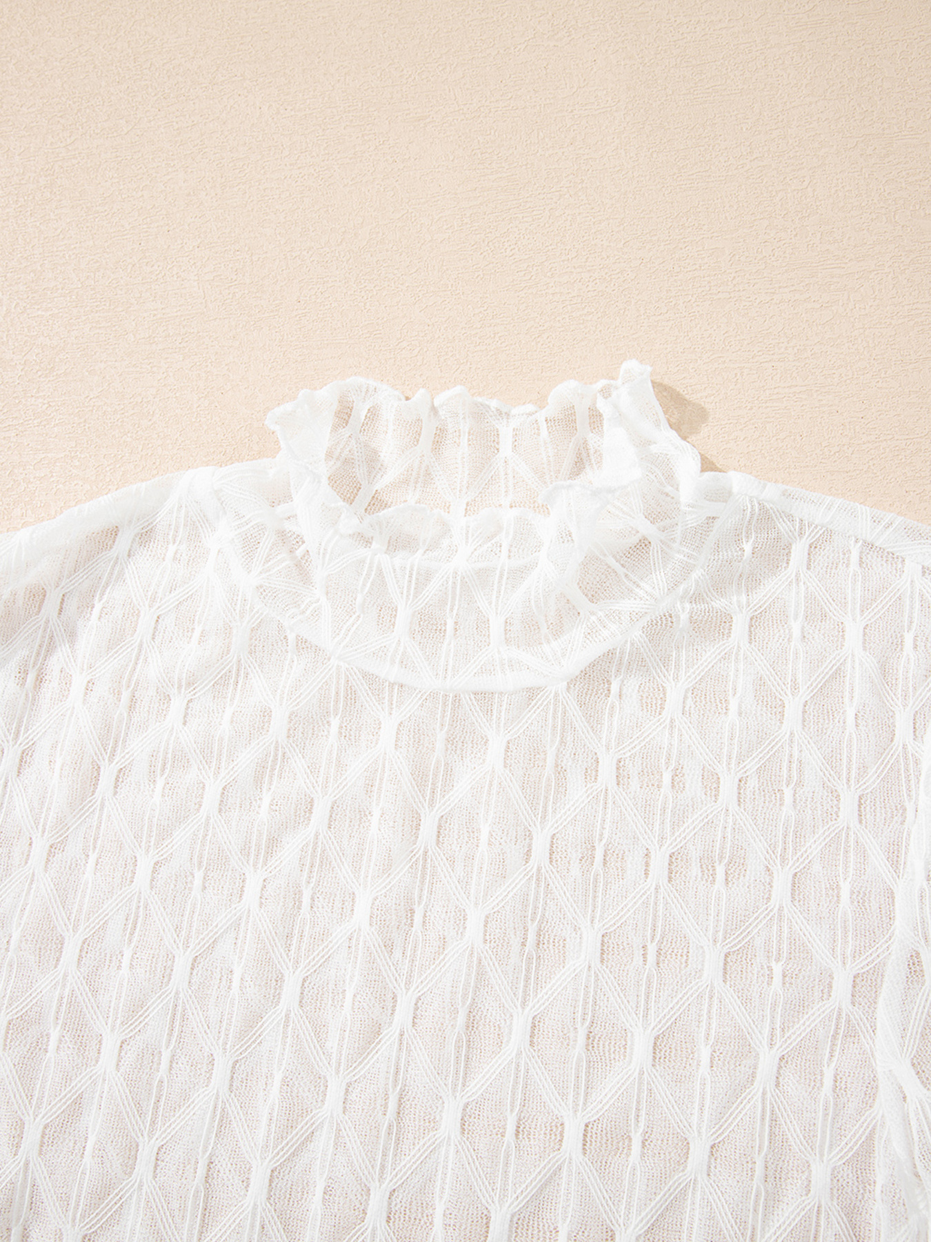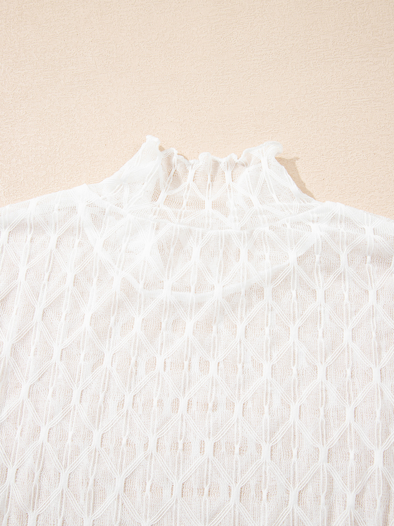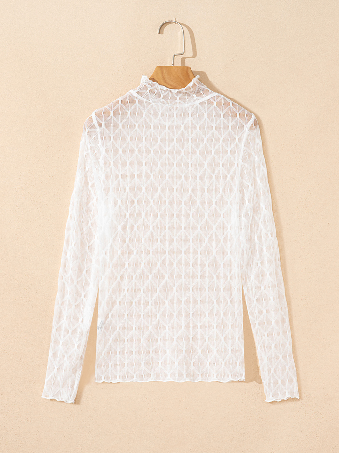 Sheer Mesh Patterned Lettuce Trim Slim Long Sleeve Top