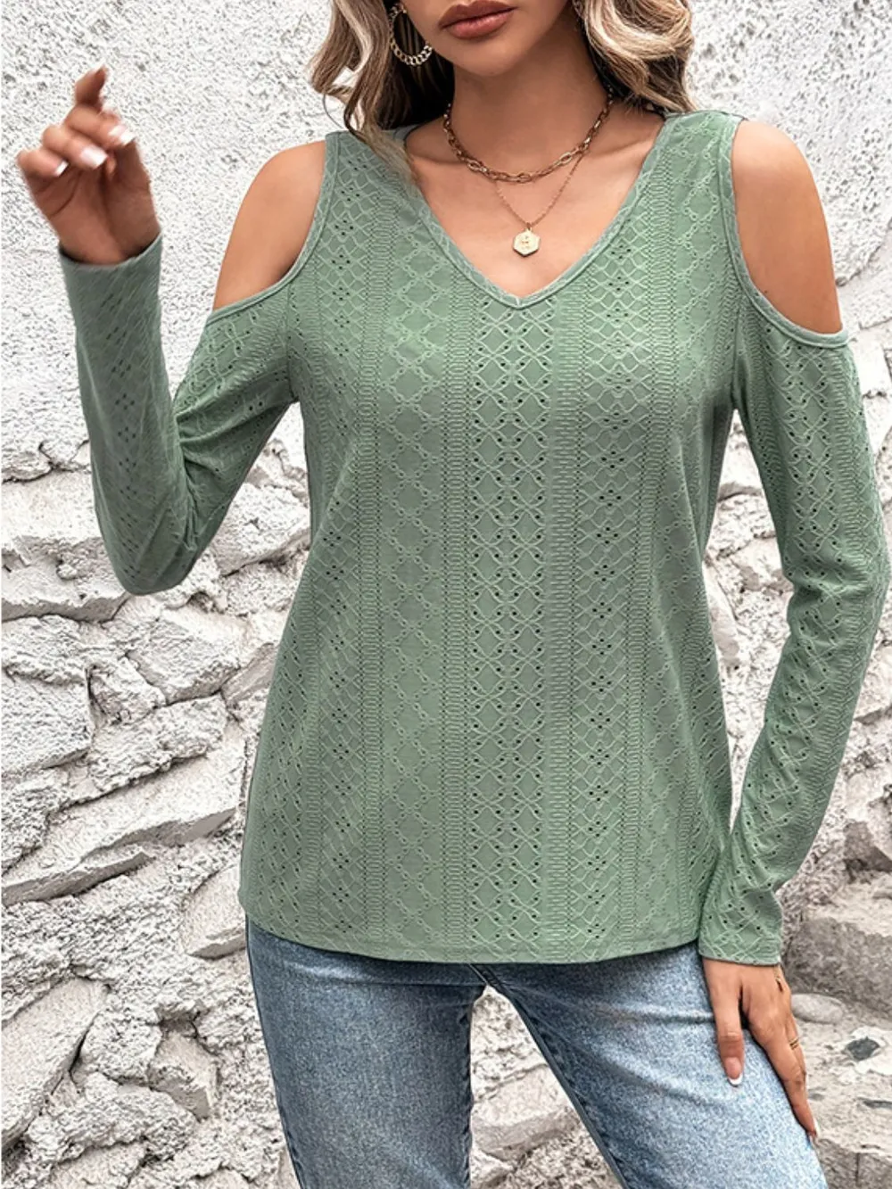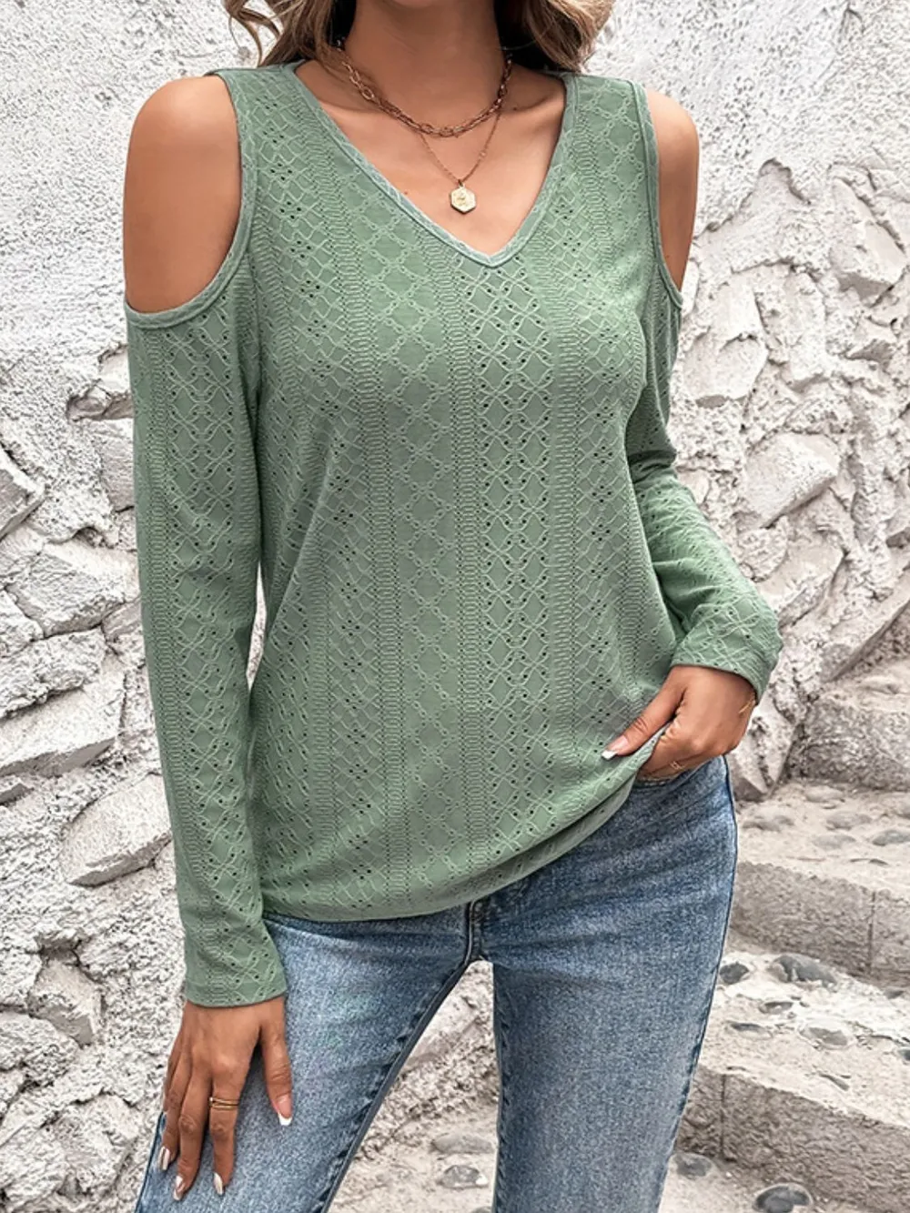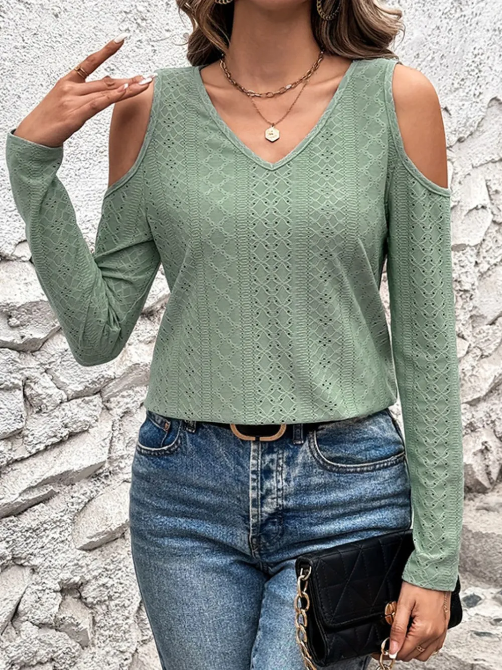 Full Size Eyelet V-Neck Cold Shoulder T-Shirt