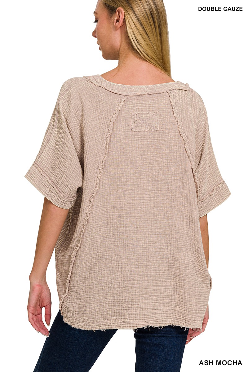 Zenana Washed Double Gauze Exposed Seam Short Sleeve Top