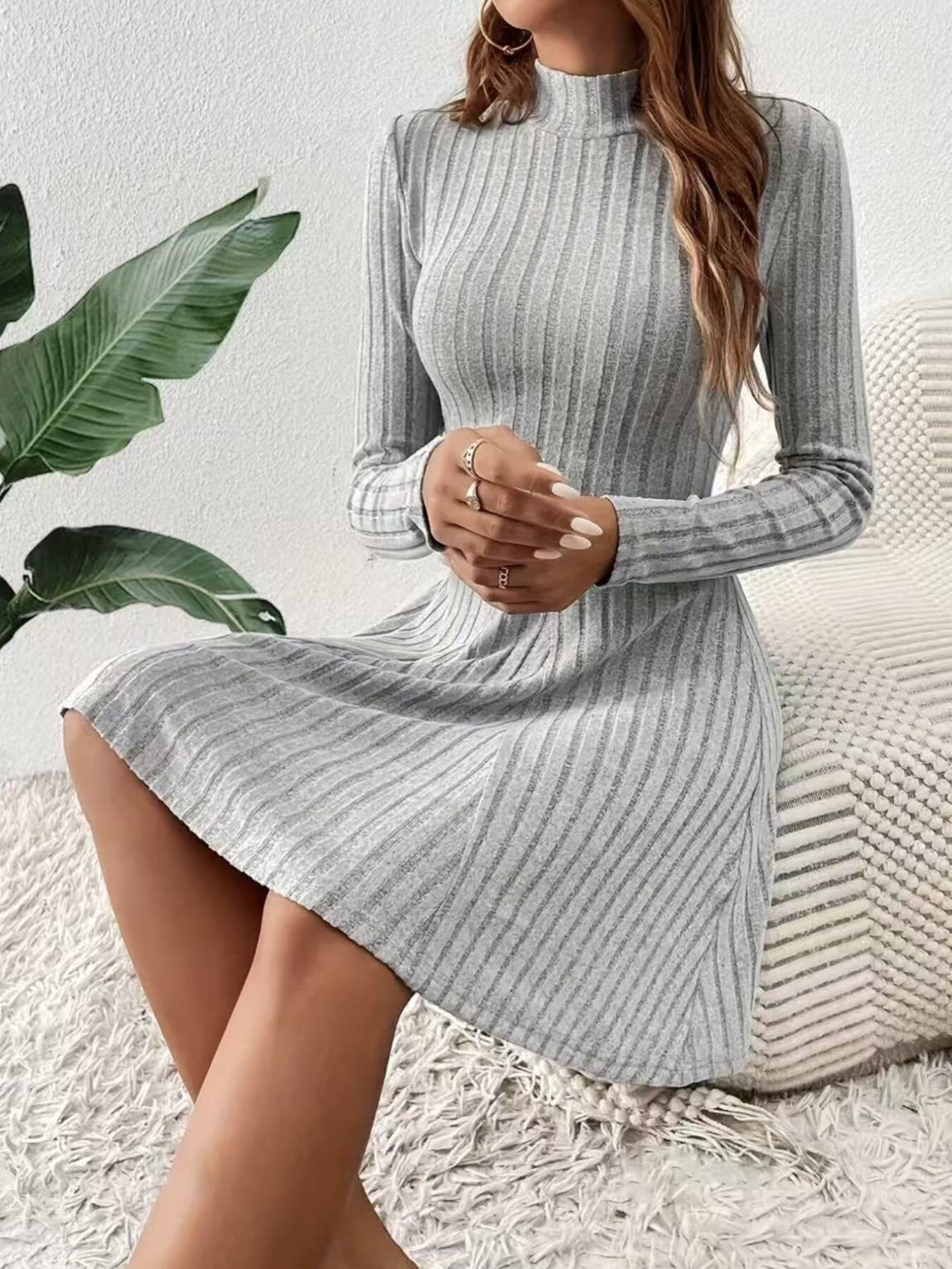 Ribbed Knit Mock Neck Long Sleeve Mini Dress