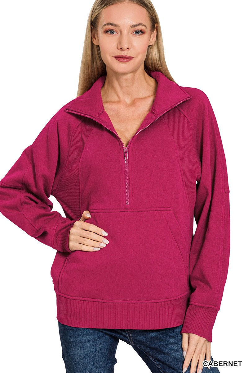 Zenana Half Zip Fleece Sweatshirt With Kangaroo Pocket
